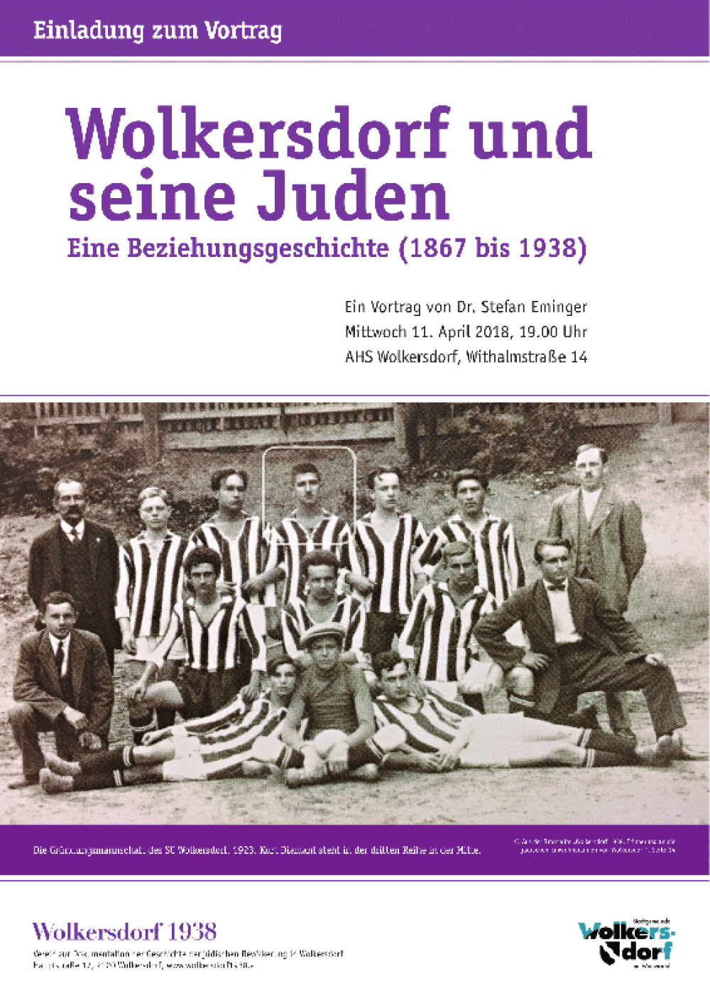 Dr. Stefan Eminger wird am 11. April 2018 einen Vortrag unter dem Titel "Wolkersdorf und seine Juden - Eine Beziehungsgeschichte (1867 bis 1938)" veranstalten. Der Vortrag beginnt um 19 Uhr in der AHS Wolkersdorf (Withalmstraße 14).